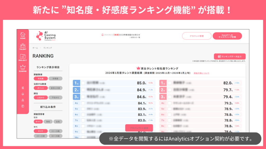 知名度・好感度データをランキング形式で閲覧可能になりました!